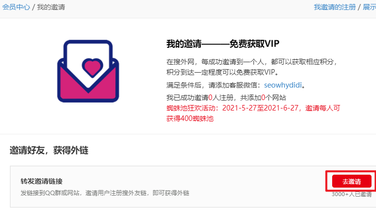 搜外友鏈每邀請一位好友注冊,即可獲得400個蜘蛛池,上不封頂!